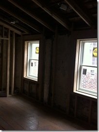 The new full light deck door on the third floor that leads out to the deck will keep that staircase bright all day. Two steps out to the deck were added on the inside of the house. Originally, the 2 steps were located outside of the house. This will keep the deck door above the roof’s level and will help prevent water from coming in during heavy rainstorms as it won’t accumulate at the bottom of the door. Lastly, a shot of the two new windows in the master bathroom.