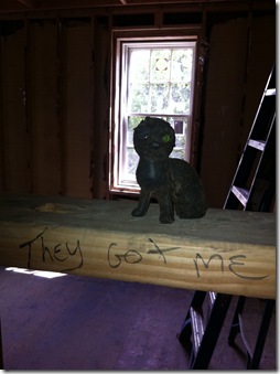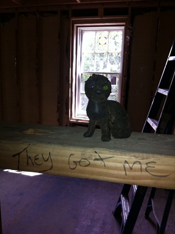 Finally, on the way out, I noticed this perched on a “wall”—the house’s mascot of the week. It’s good to know that the workers are having fun while getting the job done. Isn’t that what it’s all about ?