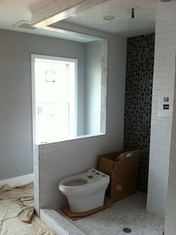 A simple backdrop to the white subway tiles while referencing the colors in the graphic glass shower tile (that we don’t love or hate). The high-gloss gray wall-hung vanity will play off well with this color.