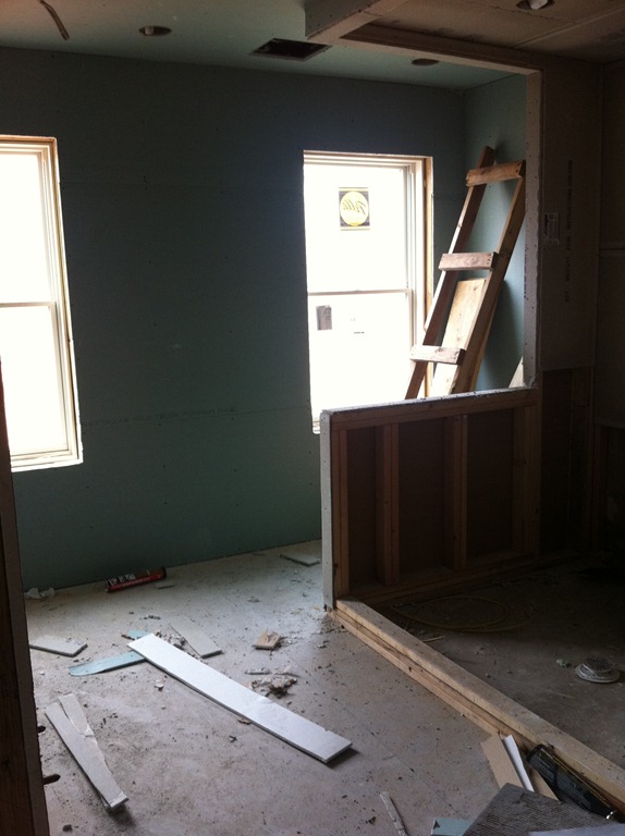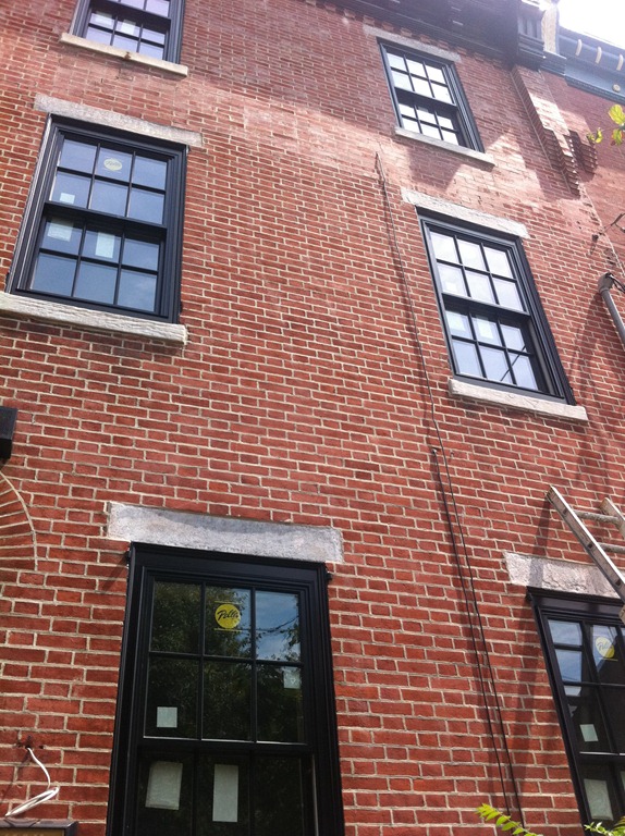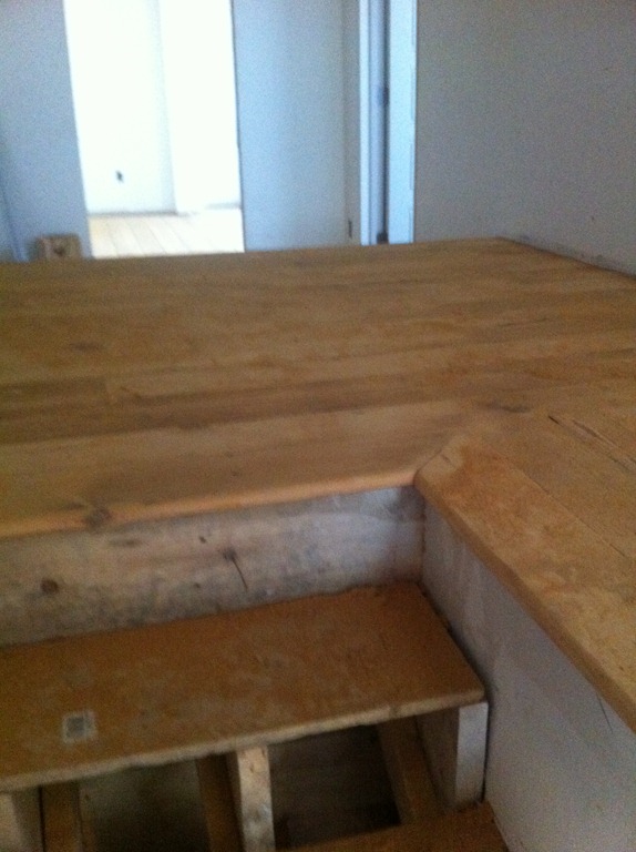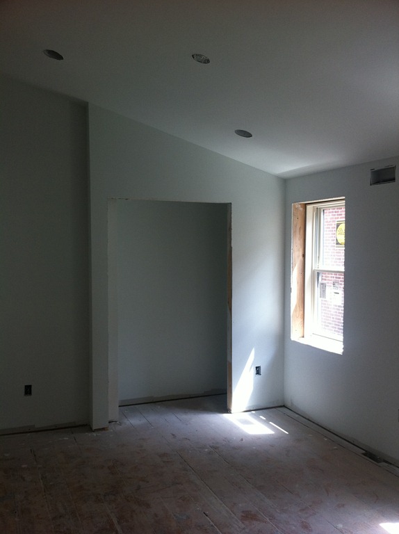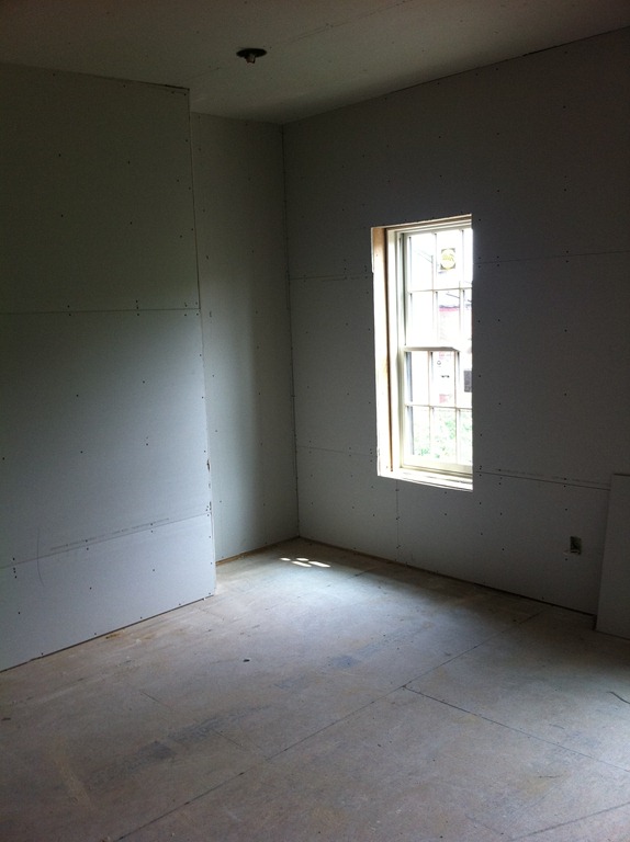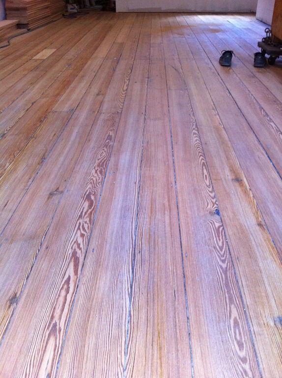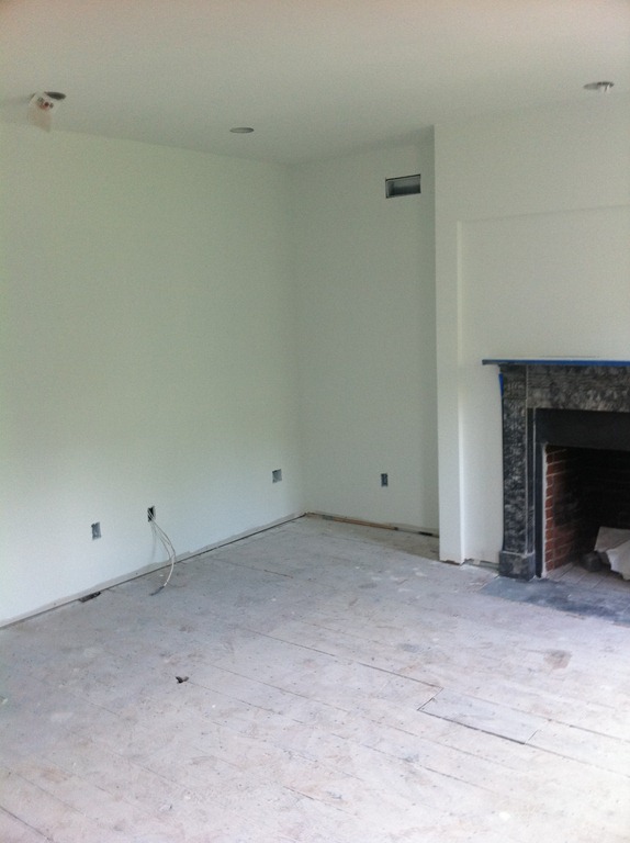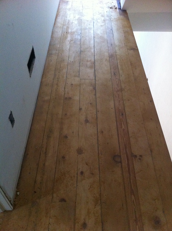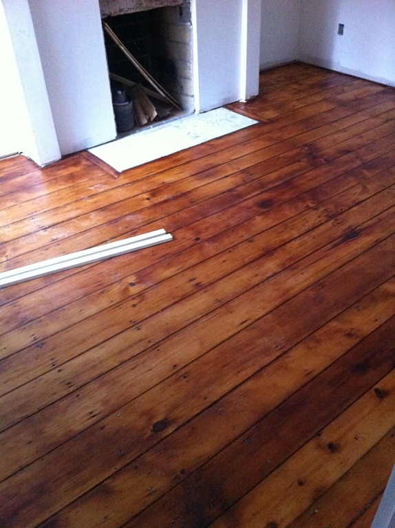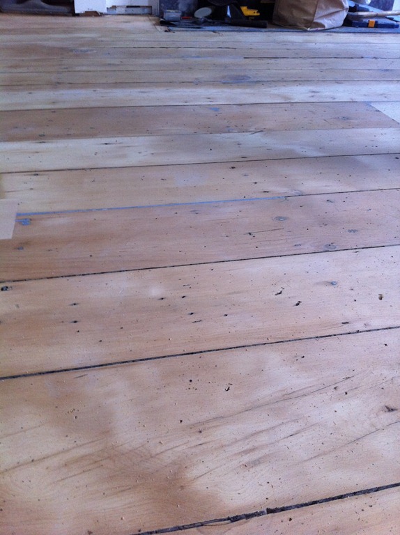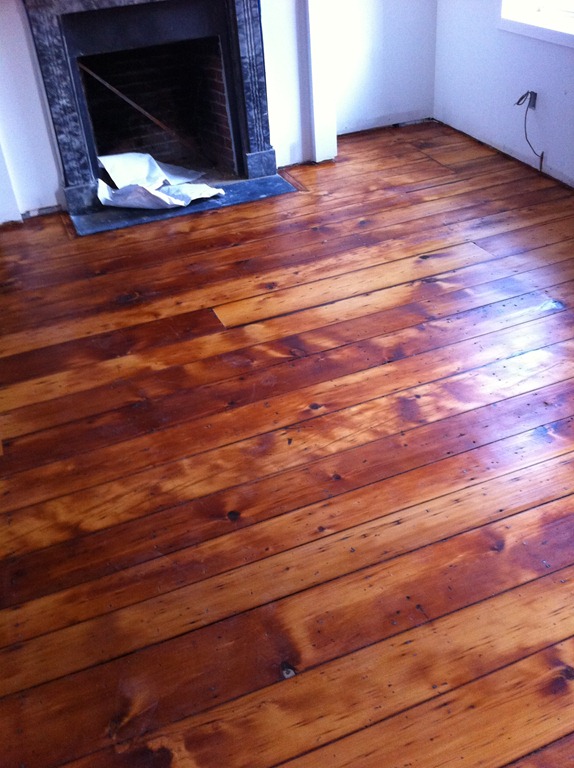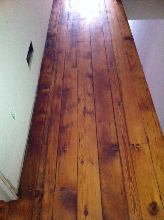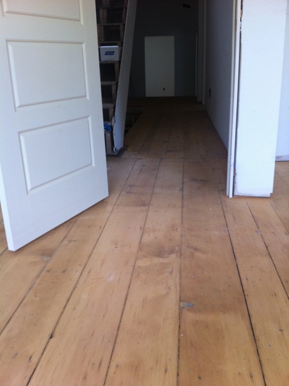 The house is lucky to have some incredible looking 100+ year-old wide-plank pine floorboards on the first and second floors. The flooring guy mentioned the species details, but I didn’t write them down so I’ll have to get them in the next week or so. The first and second floor flooring is in the process of being sanded and repaired and won’t have a sealer for a week or two. The third floor had decent floorboards, but when the entire floor (joists and all) had to come down to be replaced we were able to salvage it for patch-in on the first and second floors and went with a prefinished maple option on the third floor master suite.