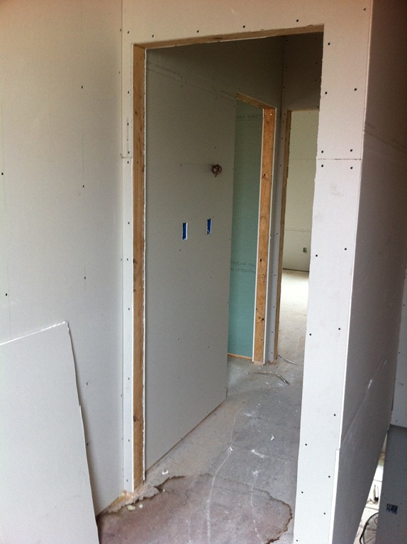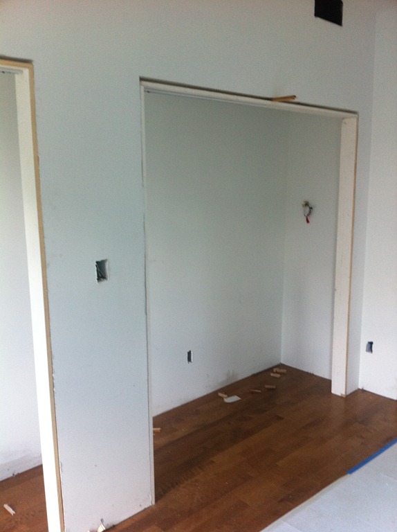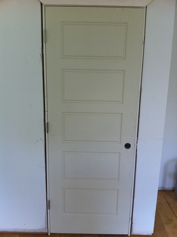 Solid maple hardwood flooring in “antique” finish for the third floor master suite. Here’s a sneak peek at the 5-panel solid core doors throughout the house.