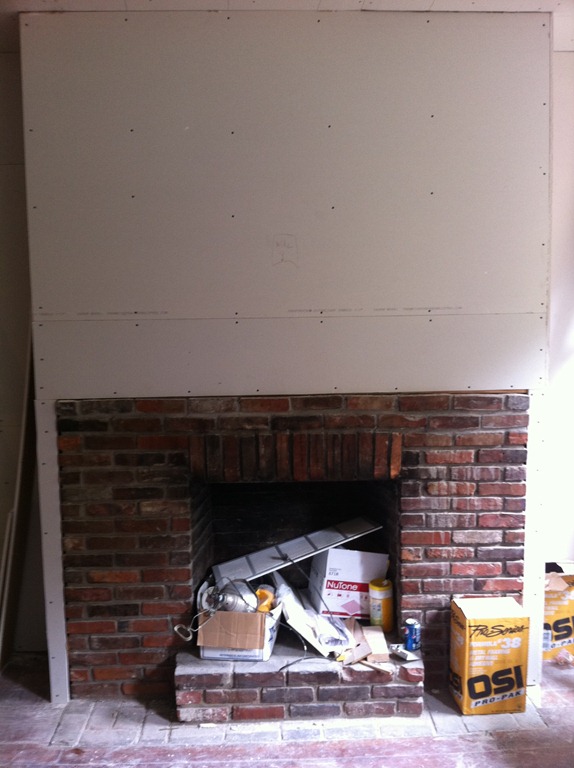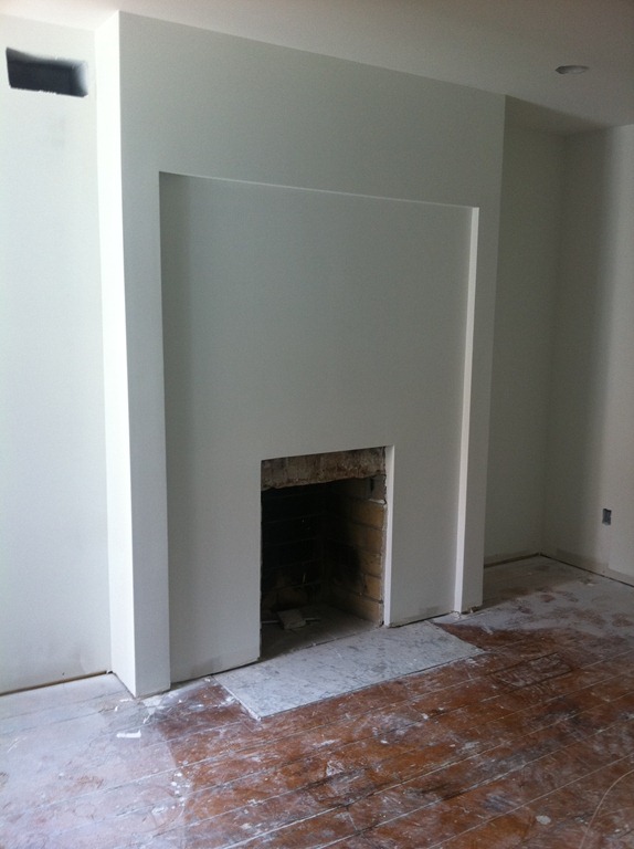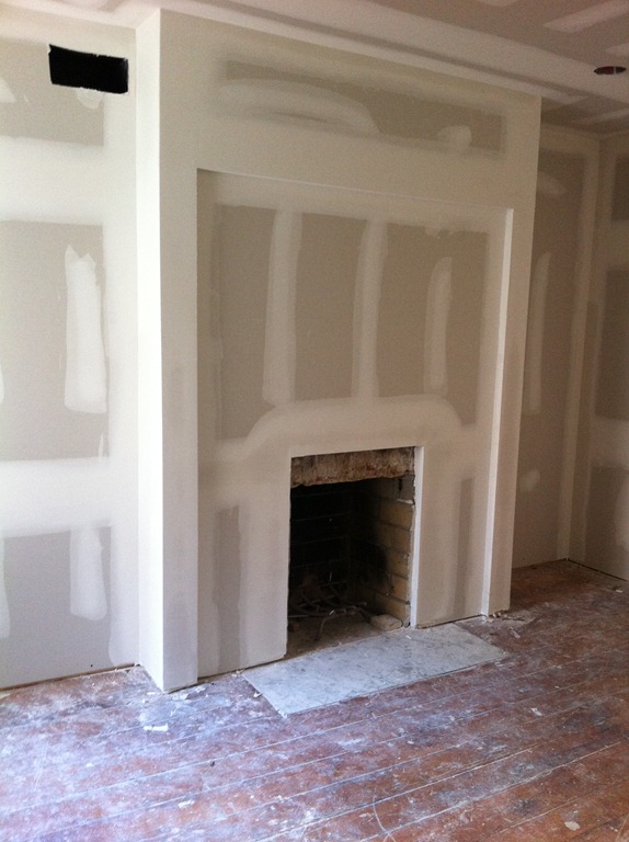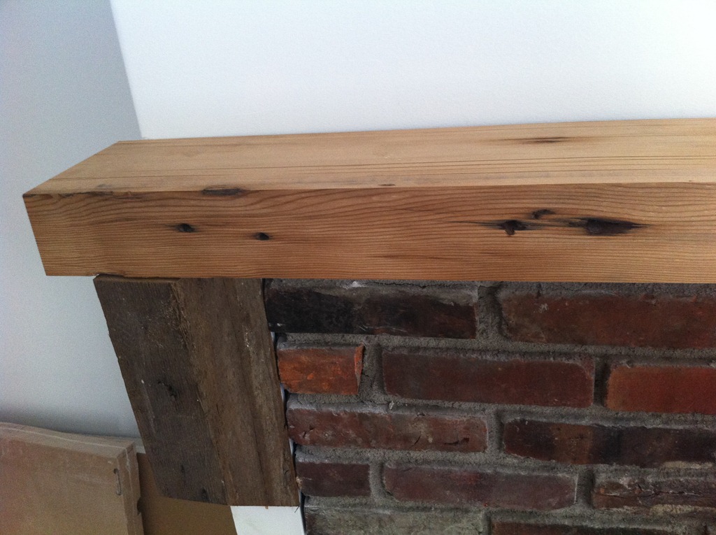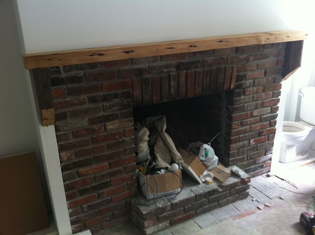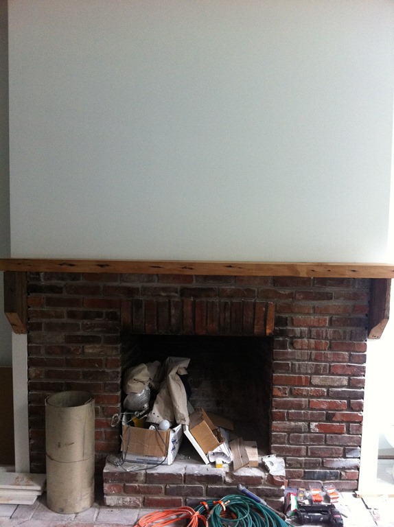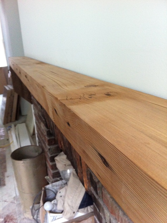 The reclaimed floor joist mantel is temporarily mounted over the fireplace—the 2 side pieces of wood won’t be part of the finished mantel. One more joist for the study’s fireplace is in the works.
