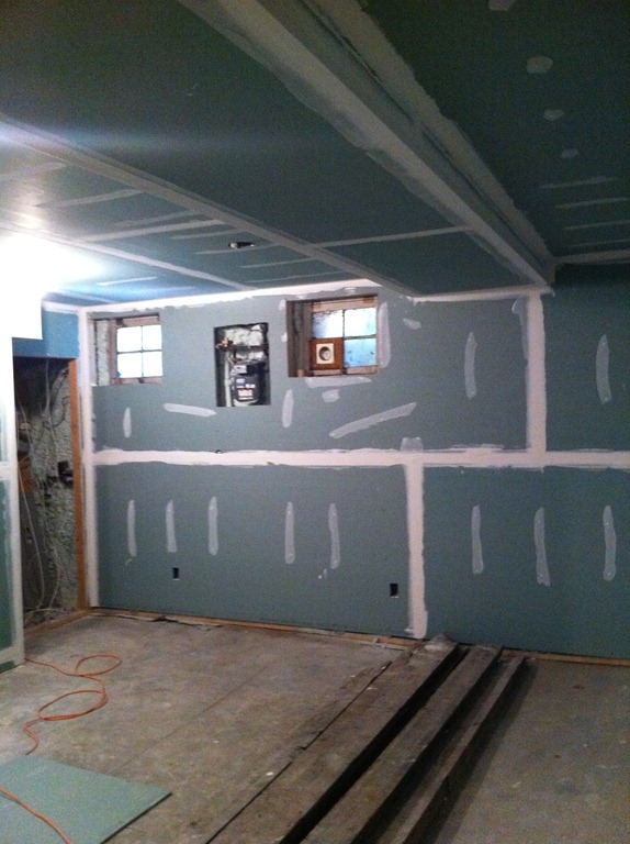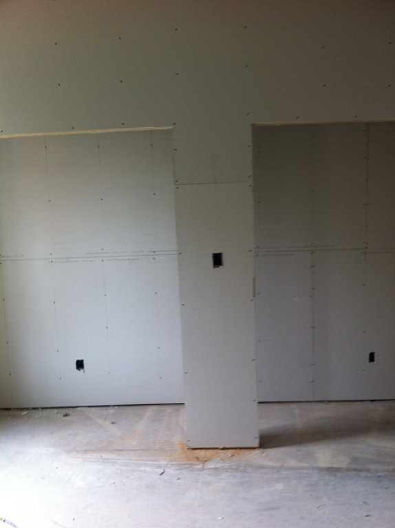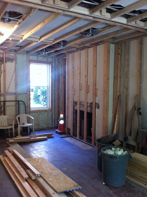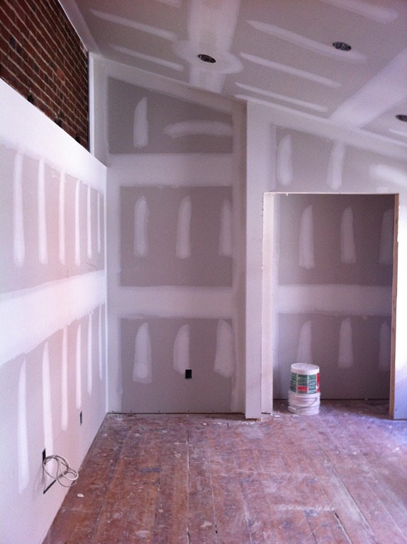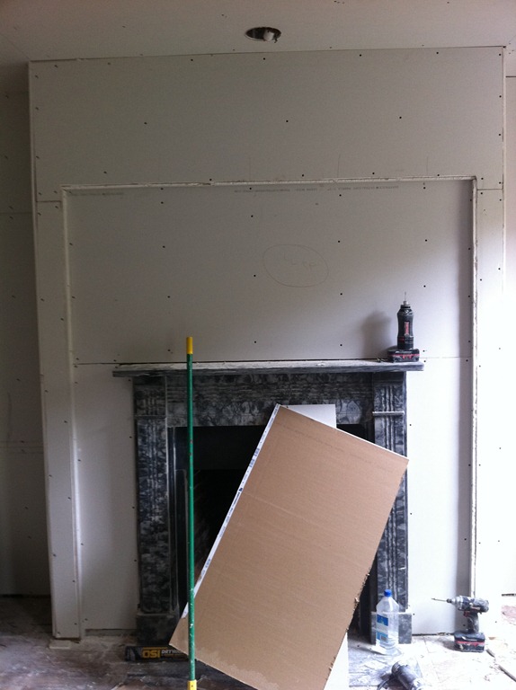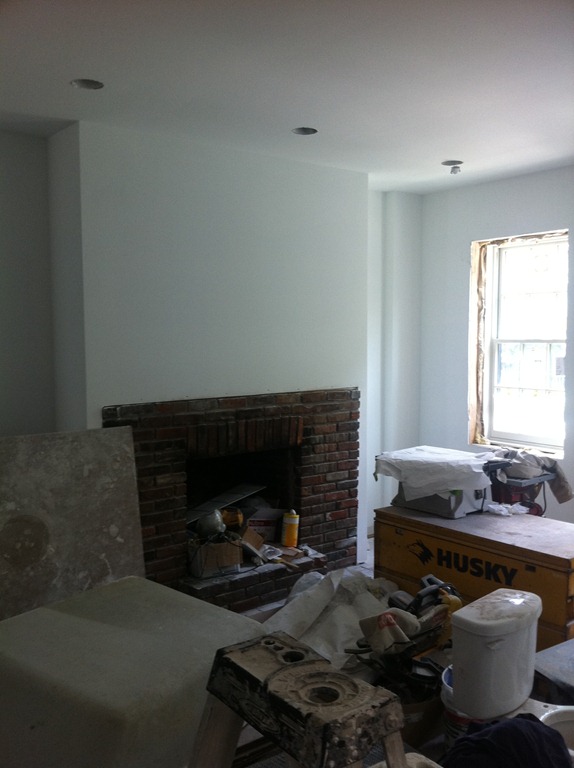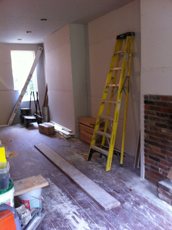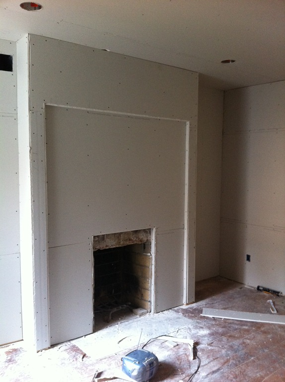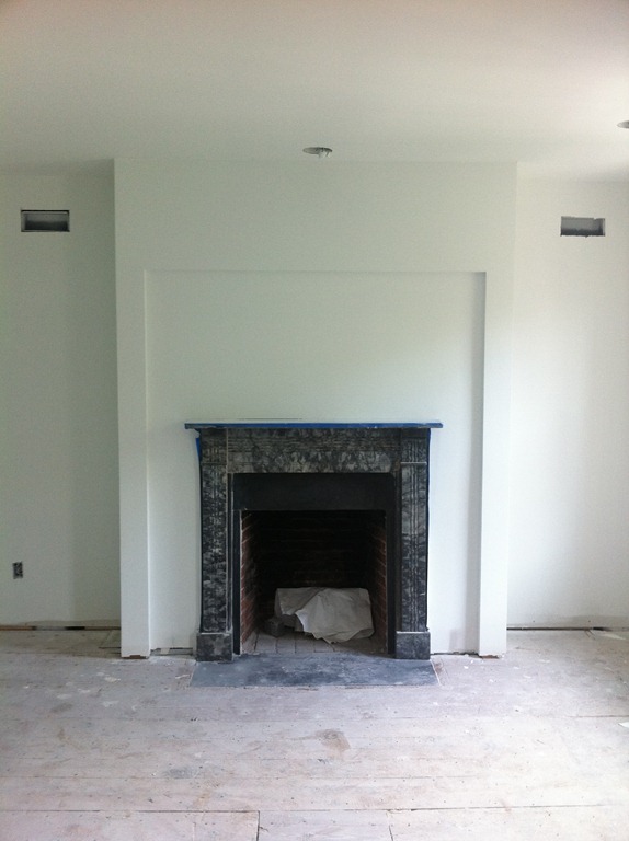 The reclaimed floor joist mantel is temporarily mounted over the fireplace—the 2 side pieces of wood won’t be part of the finished mantel. One more joist for the study’s fireplace is in the works.