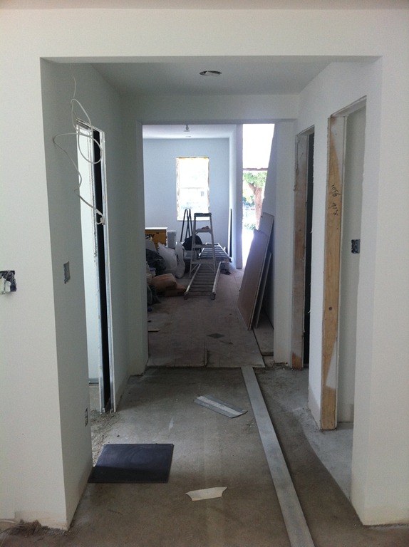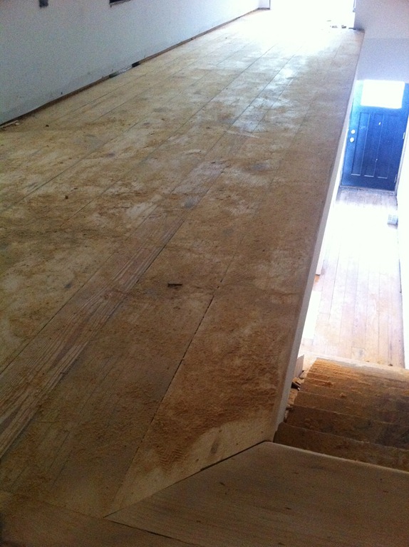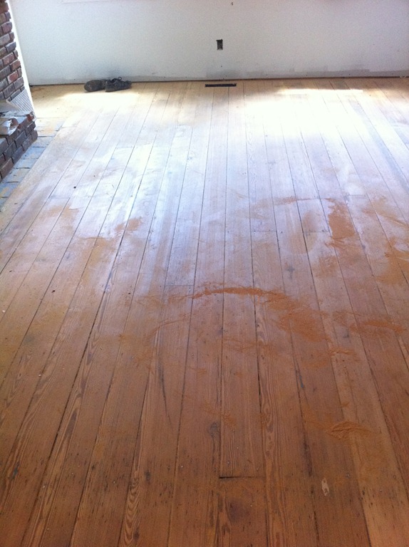 The living room and dining room floors being sanded and gaps being filled. I love how they’re not perfectly new but will be perfectly sanded down and filled to be smooth as new, yet have decades of history still visible—a perfect balance to the brand new walls and tile flooring in the kitchen. They’ll get a clear coat of satin finish polyurethane that will pull the grain and color out of the wood (see last pic in series above)—no staining required.